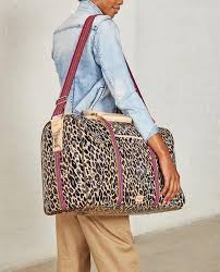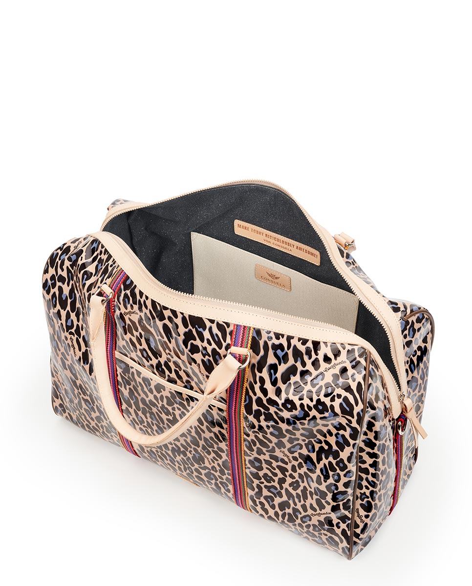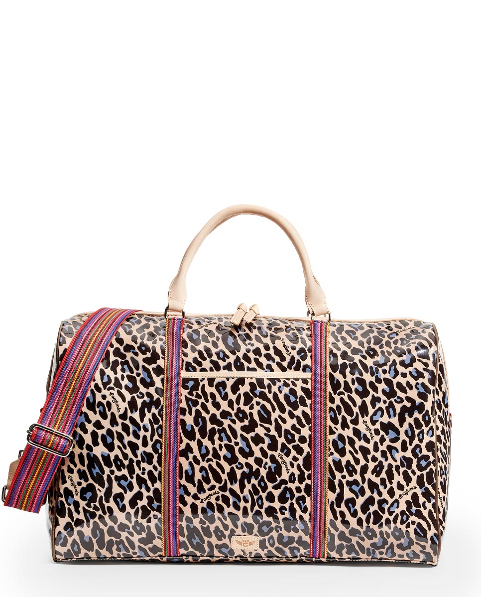 Our newest duffel style, the Weekender, is our largest bag. This Blue Jag ConsuelaCloth™ duffel is roomy enough for all your travel essentials and features leather handles, an adjustable crossbody length webbing strap, two interior pockets, and two exterior pockets. If you’re looking for a TSA carry-on compatible bag, check out the Jetsetter or the Zipper Tote!