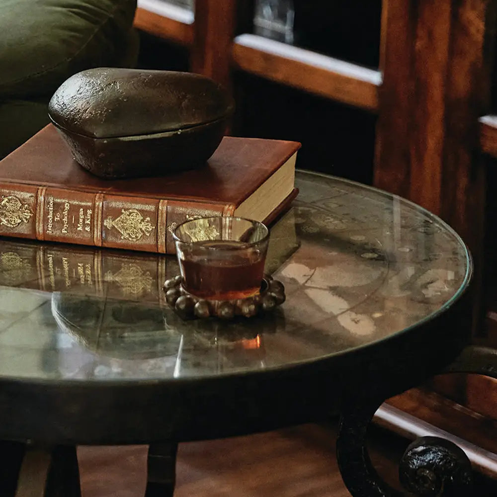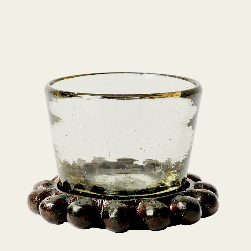 Mouth blown glass votive sitting in a wax cast ballin coaster . . . candlelight, after dinner drink . . .