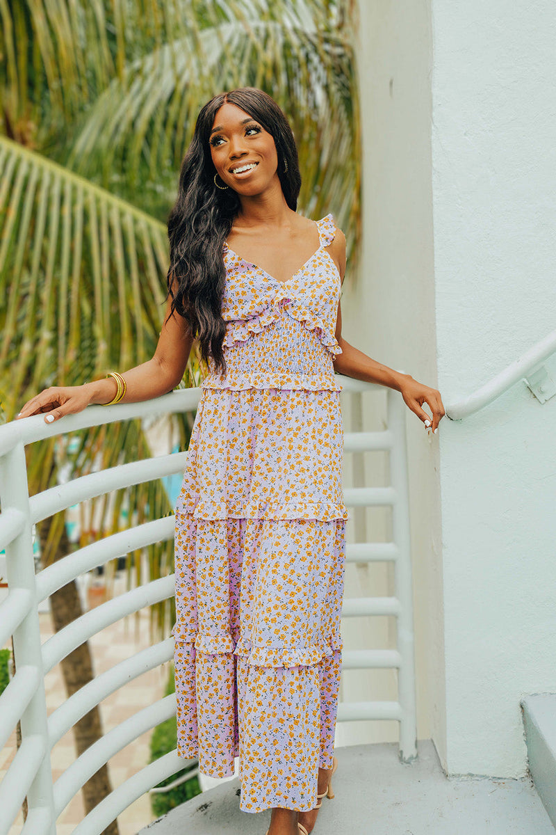 Ruffle details, a v-neck line and smocked waist makes this easy to wear dress one of our faves! Add your favorite sandals, bangles and a hat for total boho look!