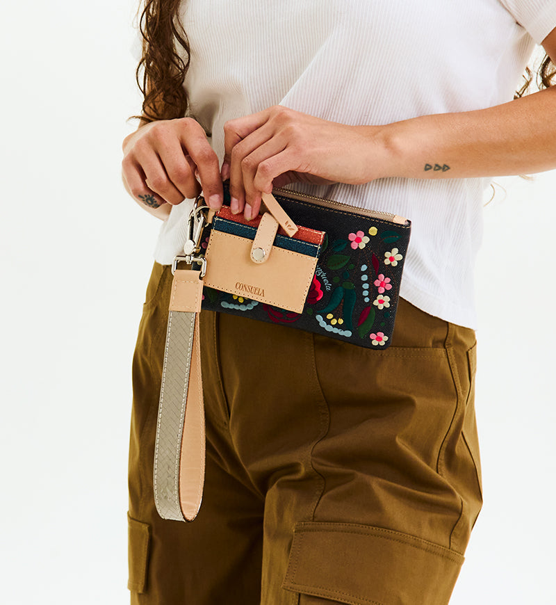 The Combi, a combination of on-the-go accessories, is a new way to carry your keys, cards, and the small stuff together or separately. This textured wristlet wallet includes a pocket pouch, secure card slot wallet and fits comfortably around your wrist.