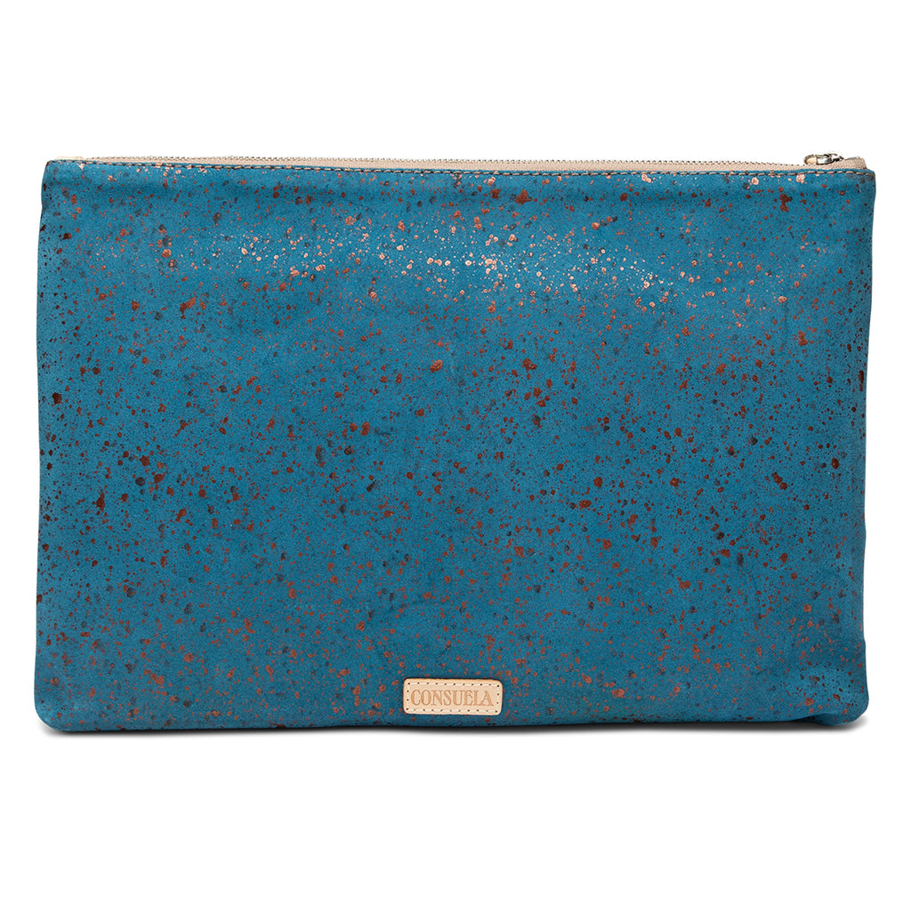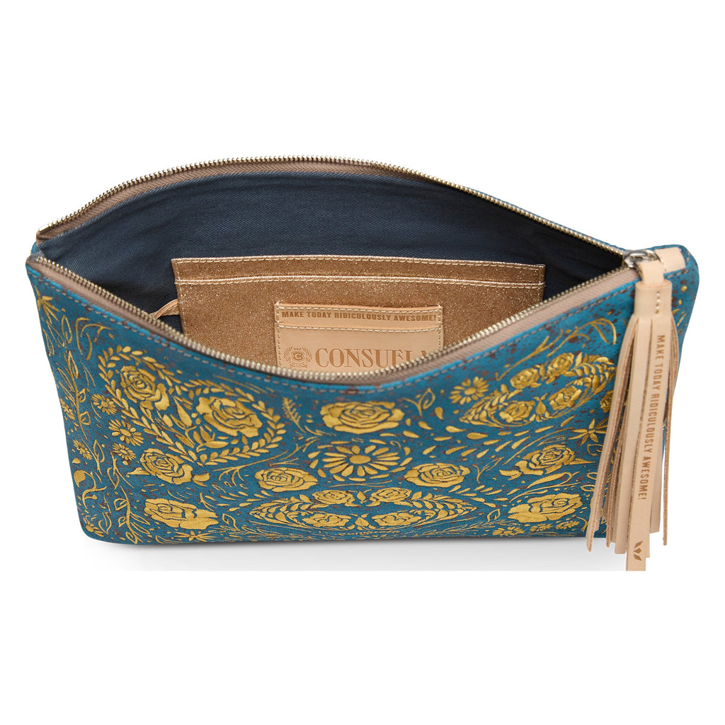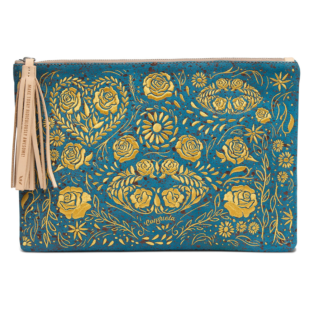 The Take Me Out Clutch was made to stand out! This unique pouch can be carried as a colorful clutch or stashed in a larger bag for stylish organization. This embroidered zipper pouch is large enough to fit most tablets, notebooks, and up to a 12” laptop.