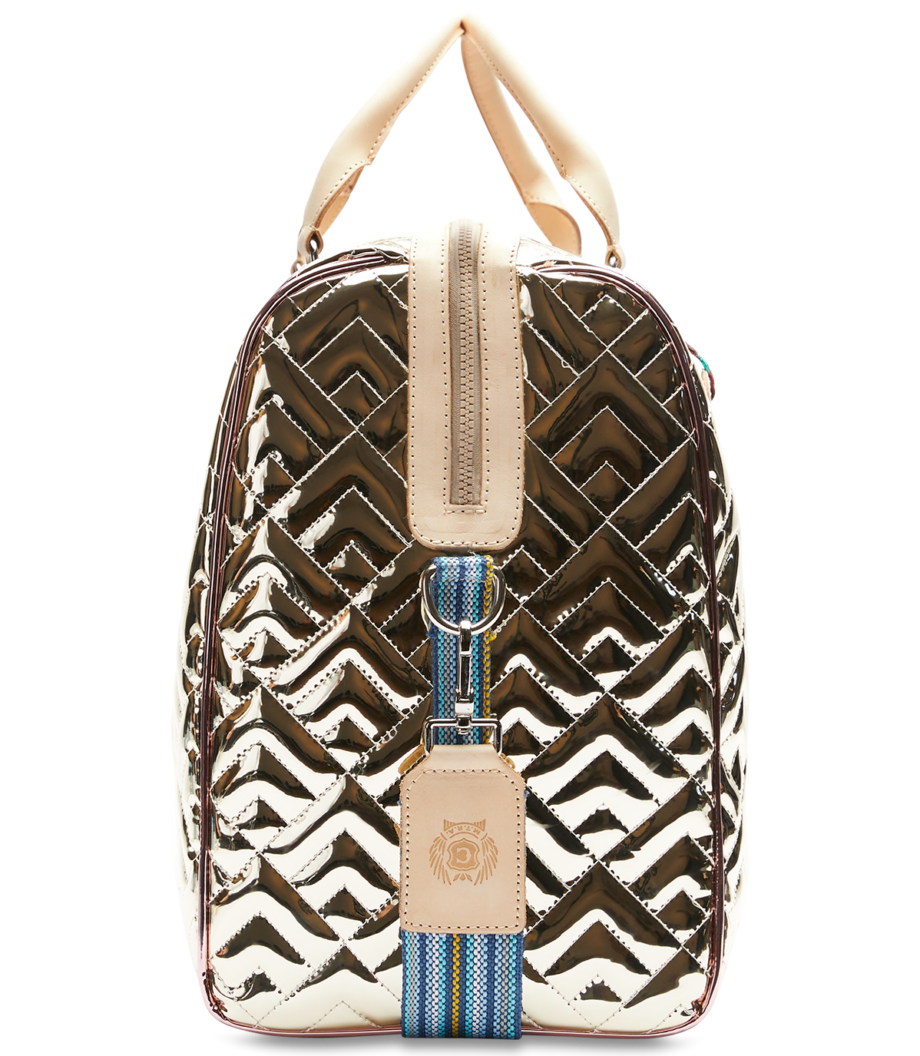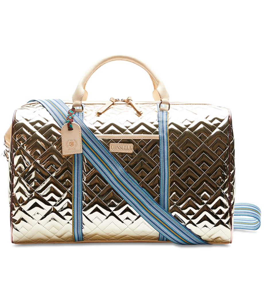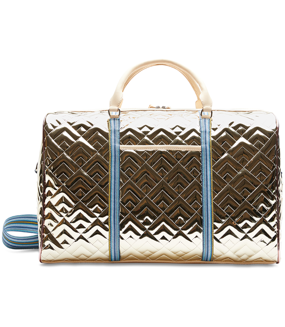 This duffle is roomy enough for all your travel essentials and features leather handles, adjustable crossbody length webbing strap, and two interior pockets.