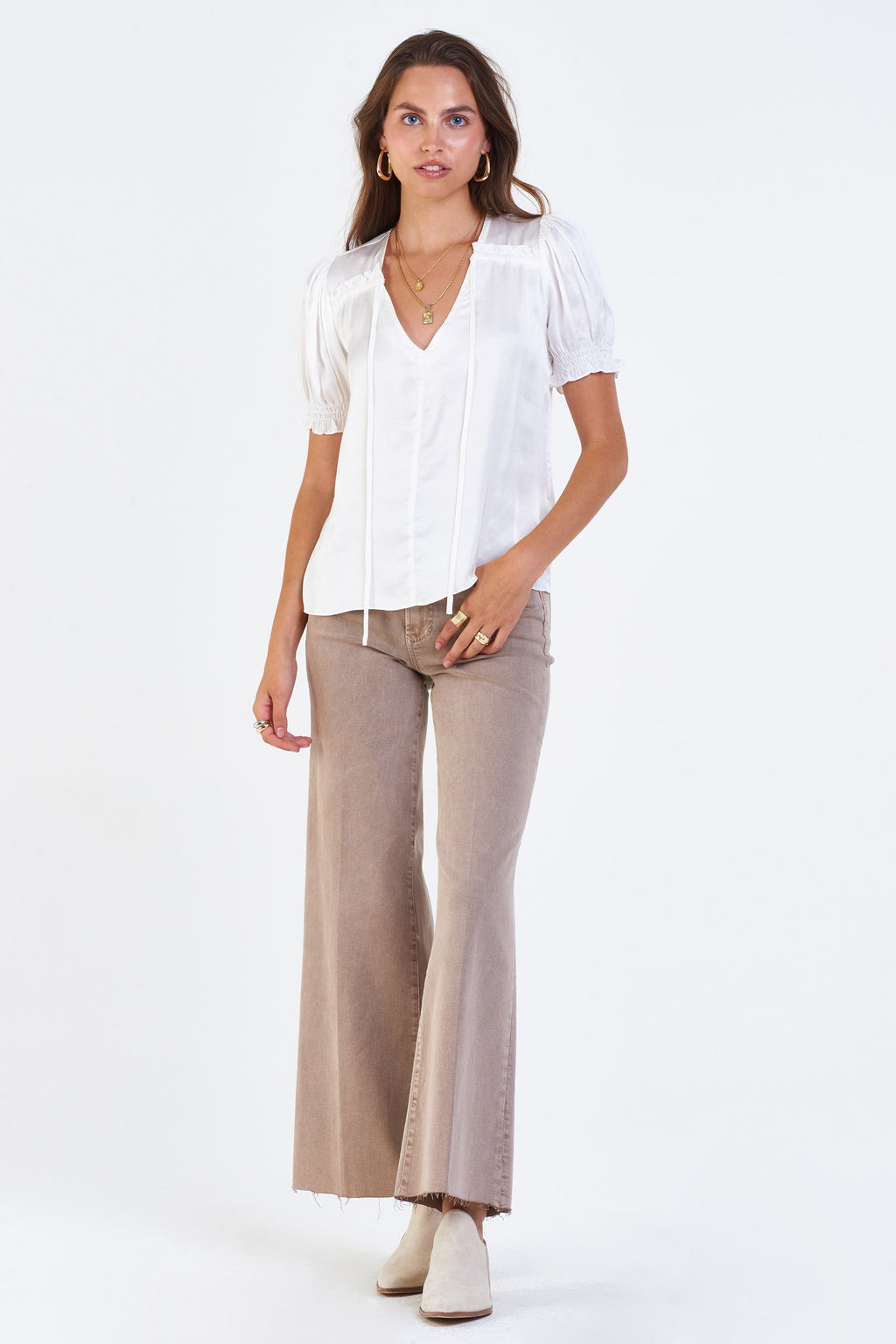 Smock cuff silky sheen shirt, v-neck finished puff sleeve with shirring, front shoulder casing with self-ties. Superfine material in chic styling, always adoring & pampering! Solid color woven on relaxed fit.