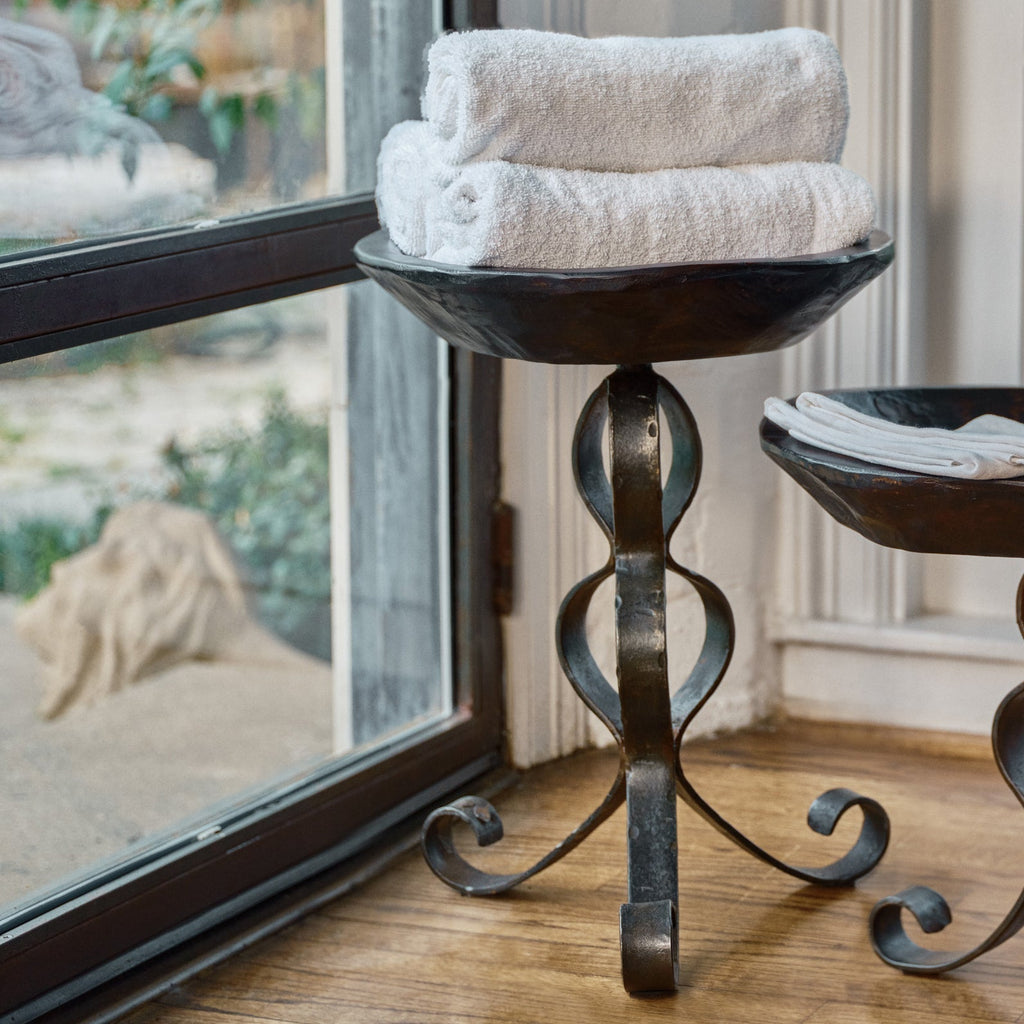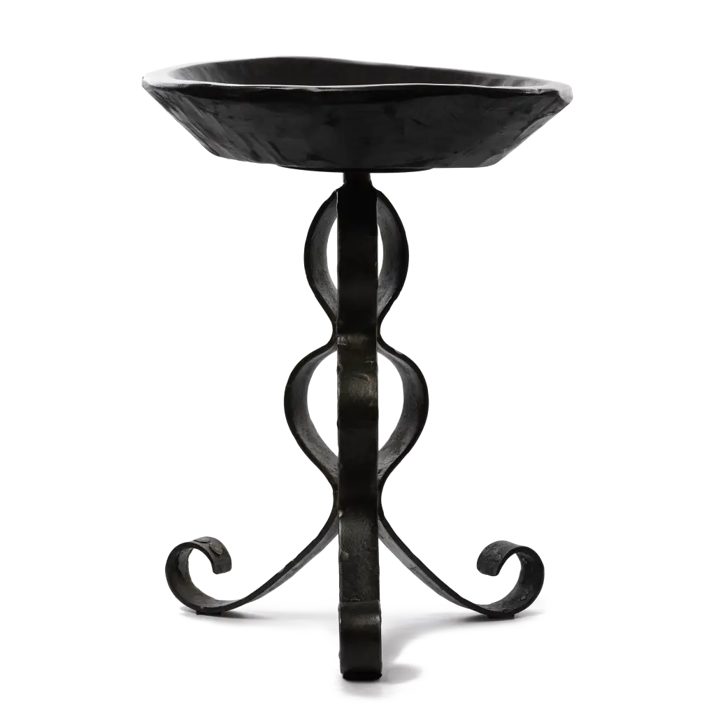 21" table with three scrolled hand forged iron legs and primitive carved wood bowl . . . perfect foundation for nesting bowls, tables . . .