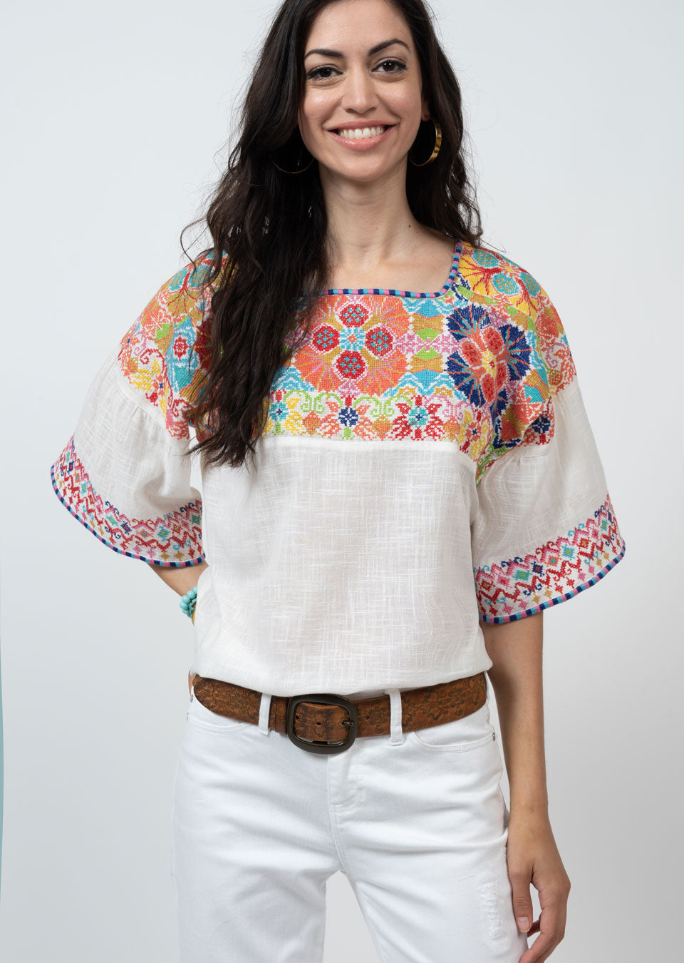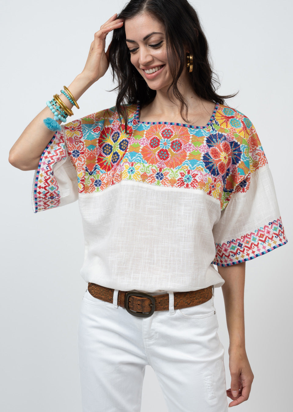Introducing CONFITTI COLORS, a stylish statement piece with unique design details. Featuring a classic white top, the arms and chest boast colorful, intricate designs that make it stand out from the crowd. Elevate your wardrobe with this eye-catching and sophisticated piece.