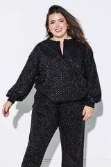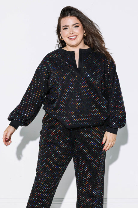 Get cozy and stylish this winter with our Black Multi Scattered Rhinestone Sweatshirt. The loose, slightly cropped fit adds a fashionable touch while the fully scattered rhinestone design adds a touch of bling to any outfit. Try pairing it with our matching joggers for a timeless cold-weather look.