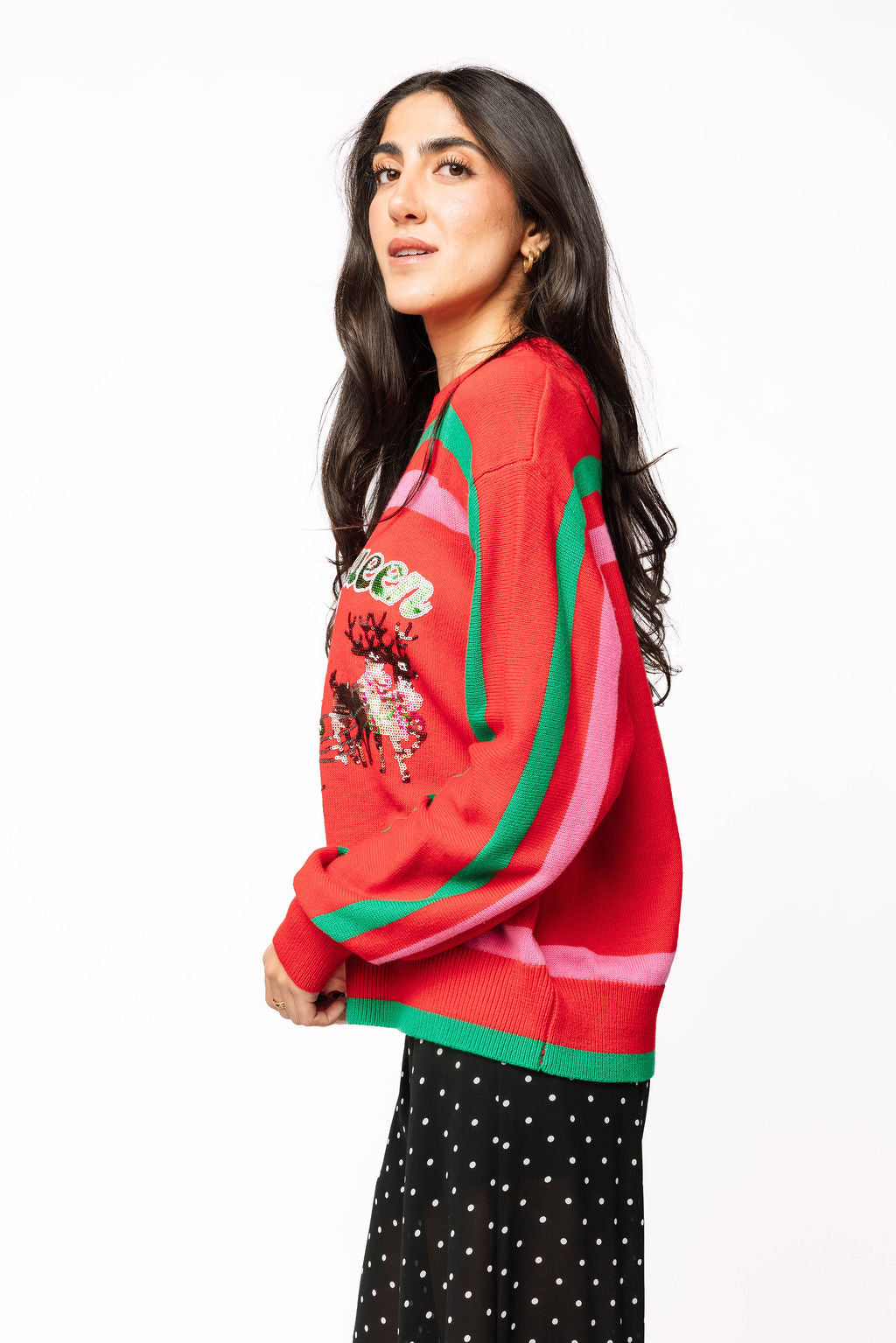 Celebrate the season in style with this Red, Green & Pink 'Sleigh Queen' Stripe Sweater. Featuring a fun Santa design and the playful phrase "Sleigh Queen," its oversized fit offers cozy comfort with plenty of room to relax. For the ultimate festive outfit, pair it with the matching skirt and own your holiday look from head to toe. Perfect for spreading cheer wherever you go!