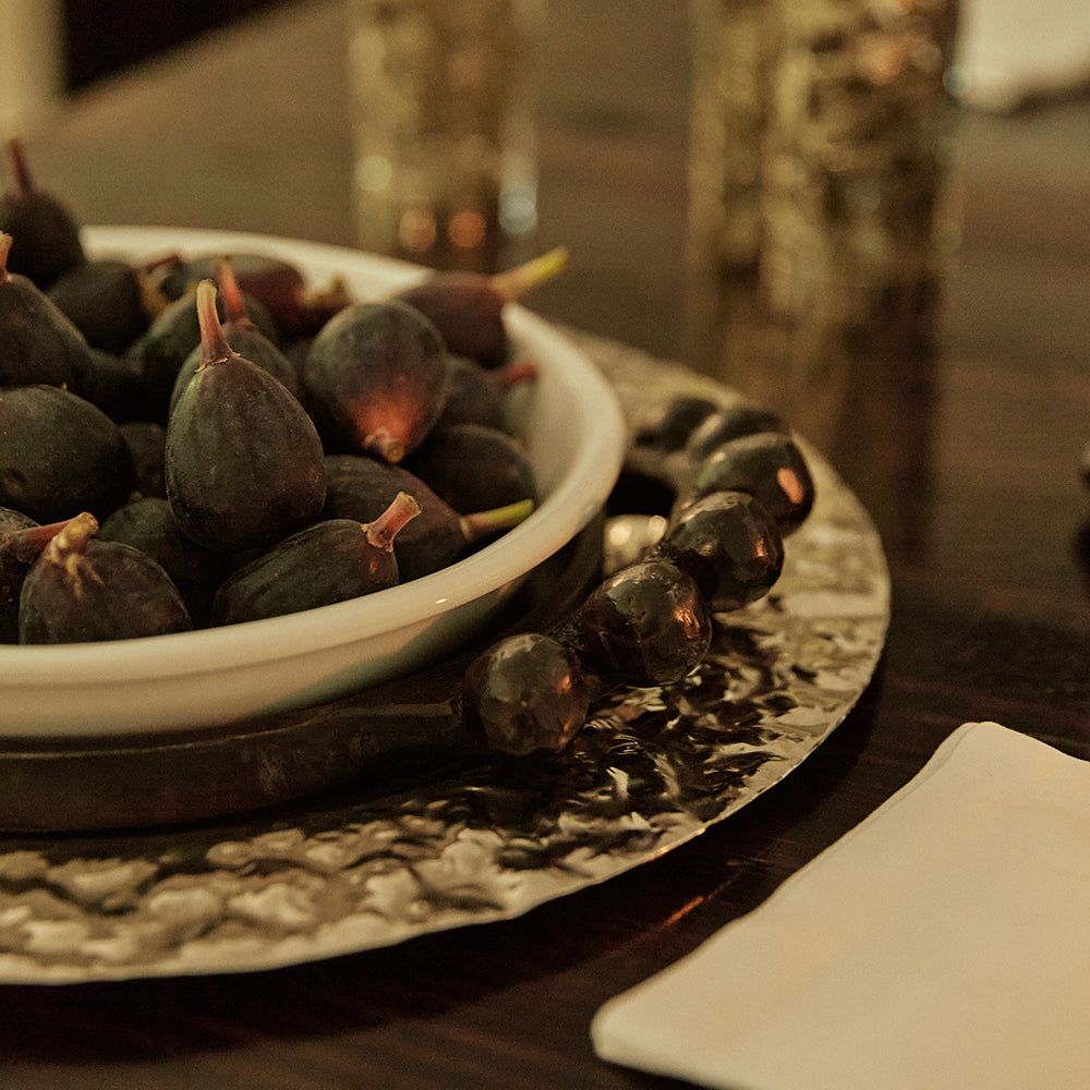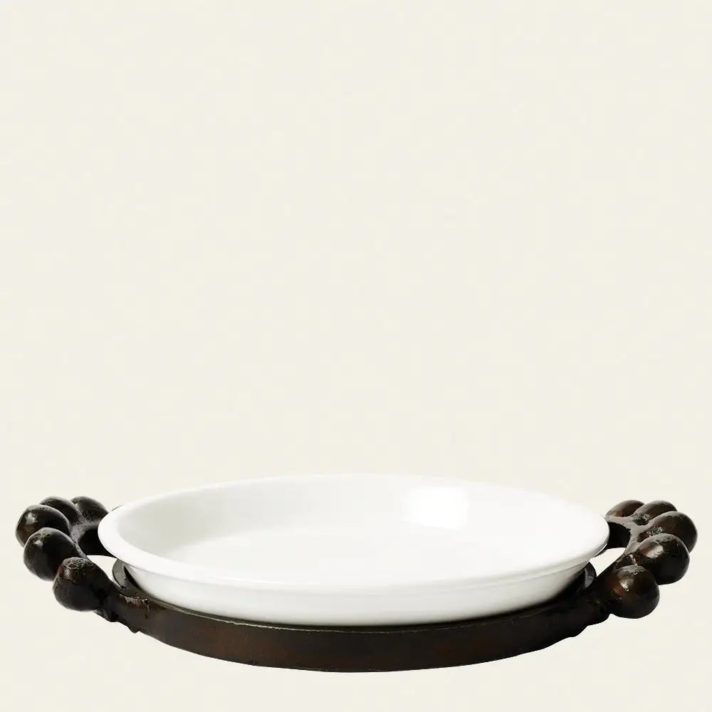 Creamy white pie plate signed by Barboglio, resting in a wax cast base with bold and classic ballin handles . . . oven-to-table serving, a decorative iron tray for the bar, a base for a potted plant . . .