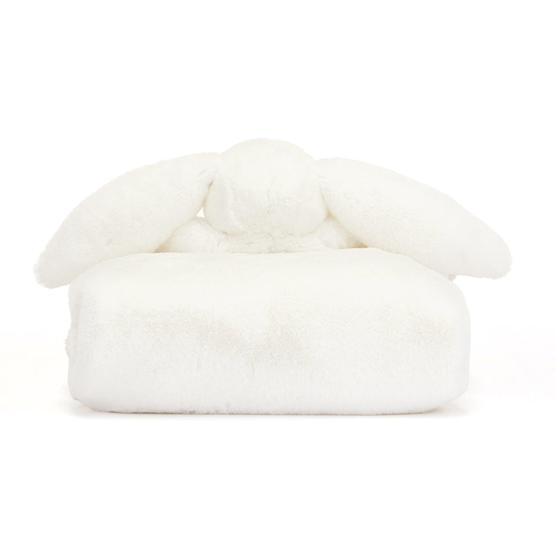 A luxurious newborn gift, the Bashful Luxe Bunny Luna Blankie is exquisitely soft in a pure white fur. Featuring the head and paws of Luna Bunny in the corner of a silky soft blanket. Rolled and wrapped with a grosgrain ribbon and elegantly presented in a satin sheen gift box with a gold foil detail and matching gift card.