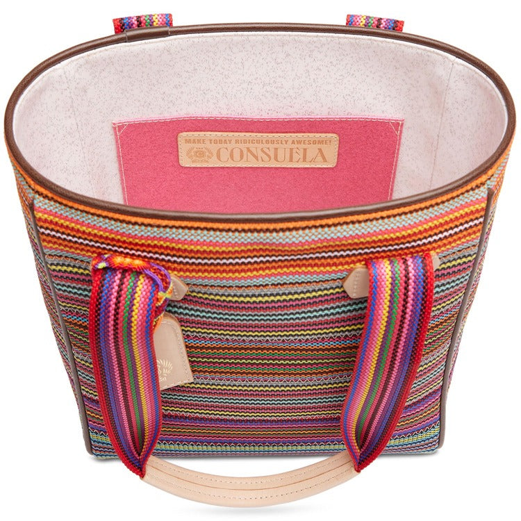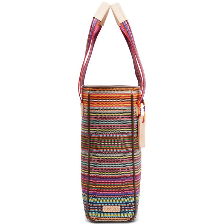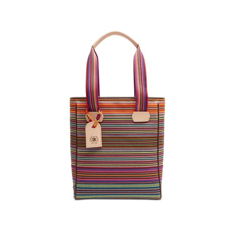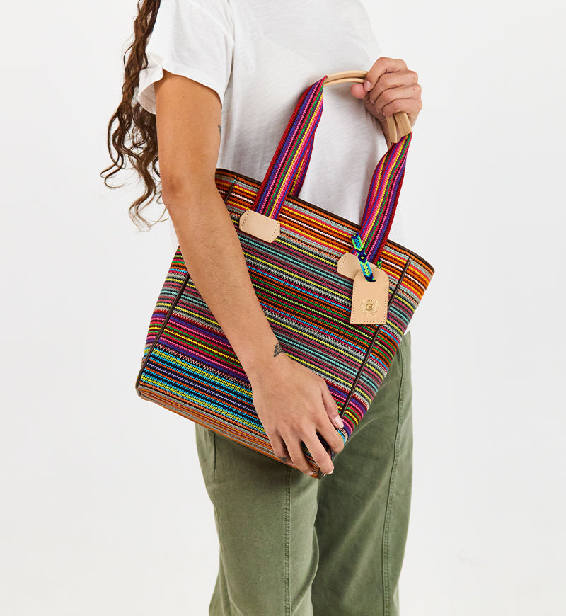 The Chica Tote is the smaller version of our signature Classic Tote. With a slim silhouette perfect for life-on-the-go, the Chica carries all you need with ease. Topped with comfortable woven handles, this multi-functional tote is trimmed in natural leather and crafted to hold its shape. Our tote features a roomy interior and pockets.