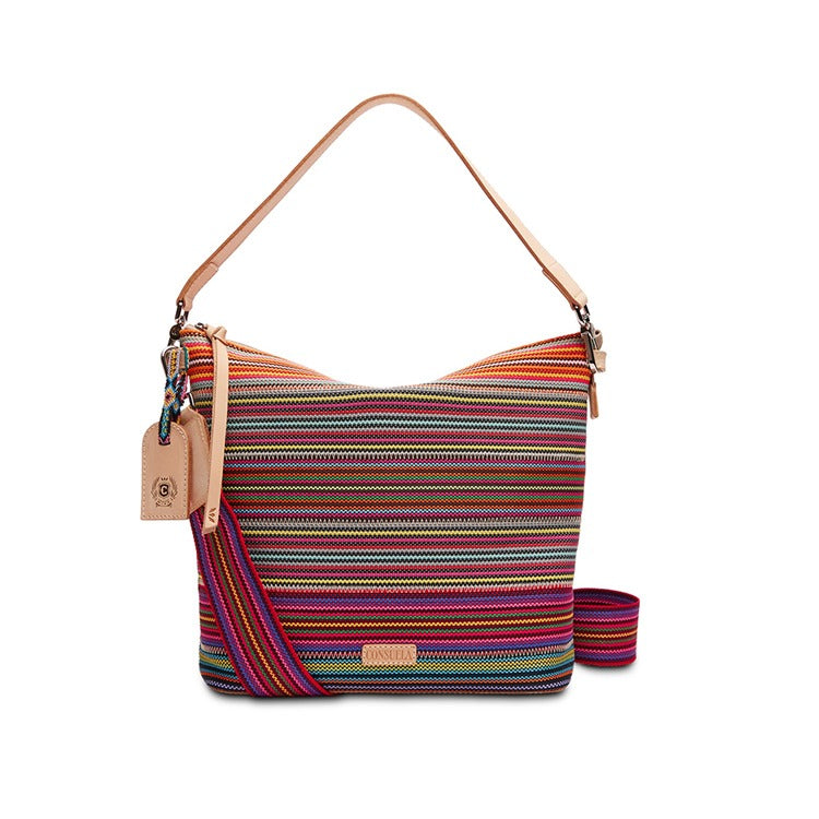 The Hobo is a convertible crossbody or shoulder bag with two included straps. This multicolored bag comfortably carries the essentials and much more. Perfect for those who like to be prepared for anything and everything!