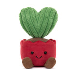 Amuseables Kerrii Cactus is the luckiest of lucky hearts. A green, cordy heart-shaped leaf is nestled in textured brown soil. A smiling red pot with a scallop trim, and cocoa cordy legs.