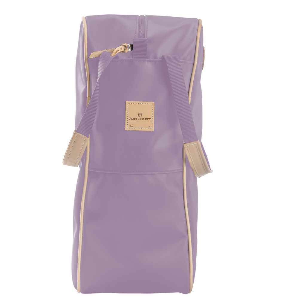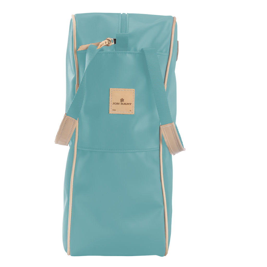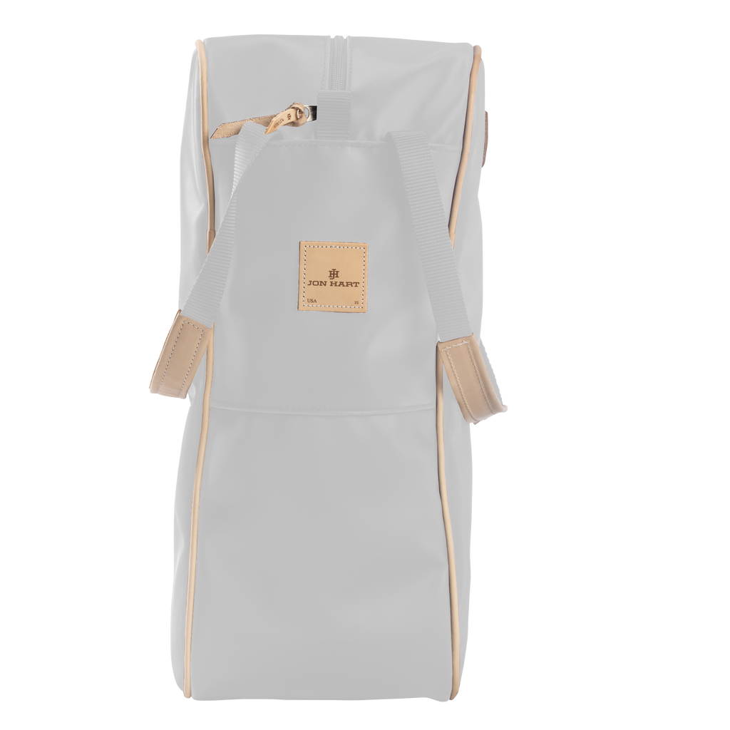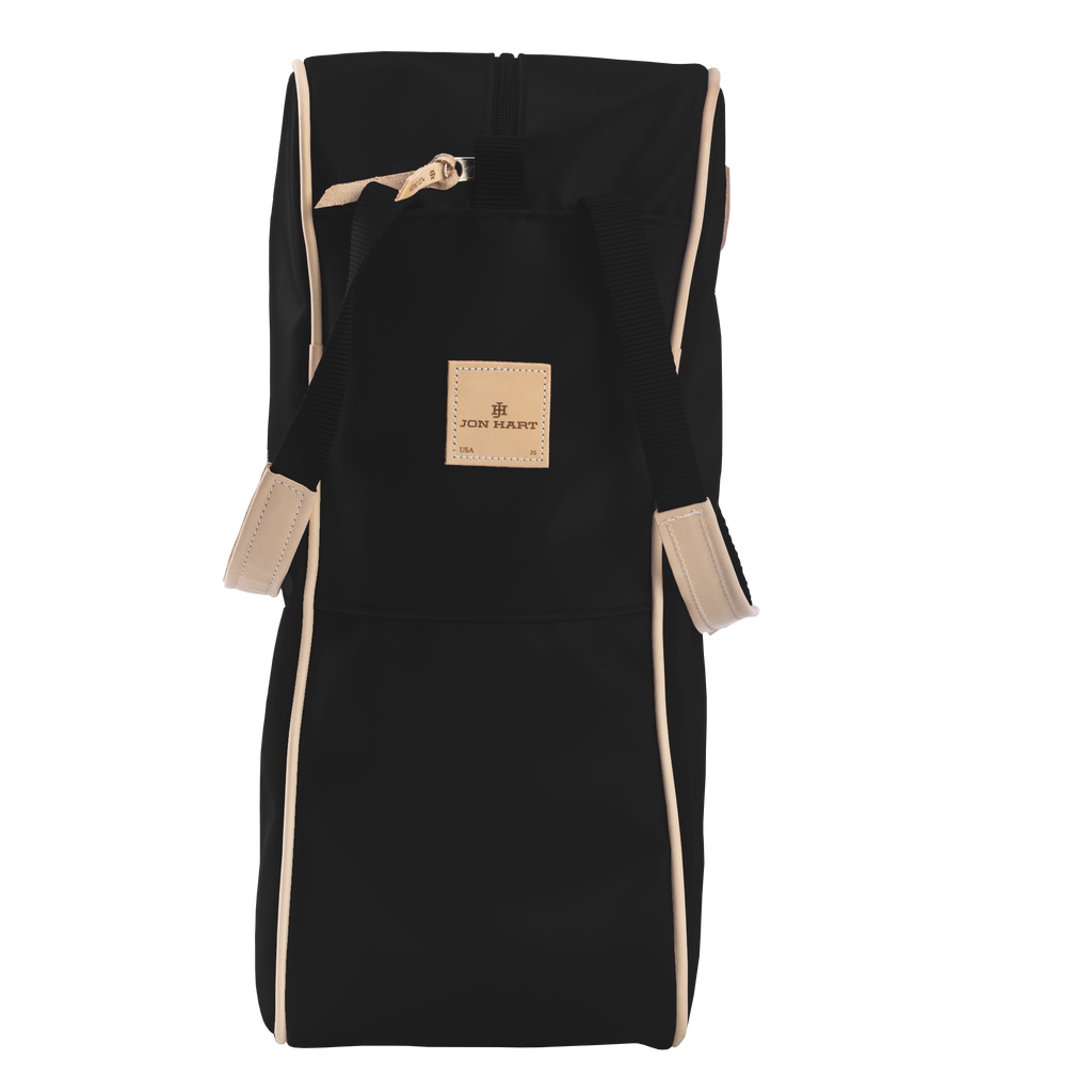 Coated canvas with Natural Leather trim. Holds up to a size 14 boot.