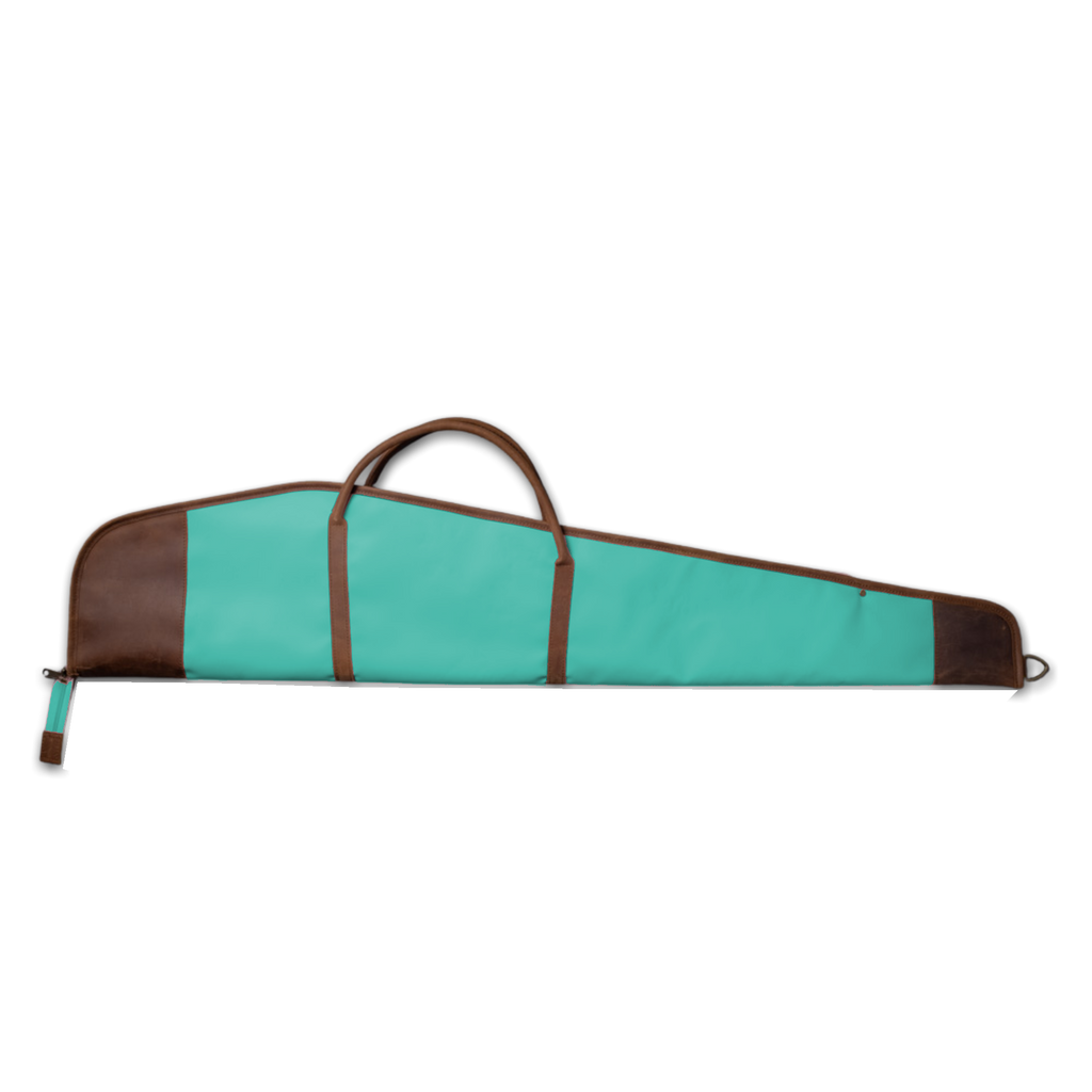 Coated canvas with Oiled Leather trim. Fully lined in fleece for protection. Oiled Leather handles that extend to the base. Zippered closure with antique brass hardware antique brass D-Ring to hang for easy storage easily holds a rifle with a scope.