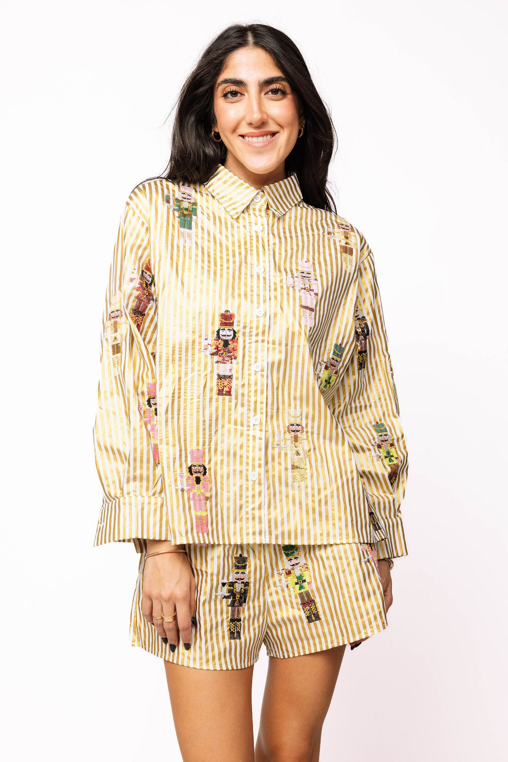 Add a festive sparkle to your party look with this Gold Metallic Stripe Cocktail Serving Nutcracker Button Up Top. Shimmering gold stripes catch the light perfectly, while the button-up style keeps things classically chic. Ideal for holiday celebrations or any joyful gathering, this top blends playful charm with a touch of elegance. Dress it up or down and get ready to shine all night long!