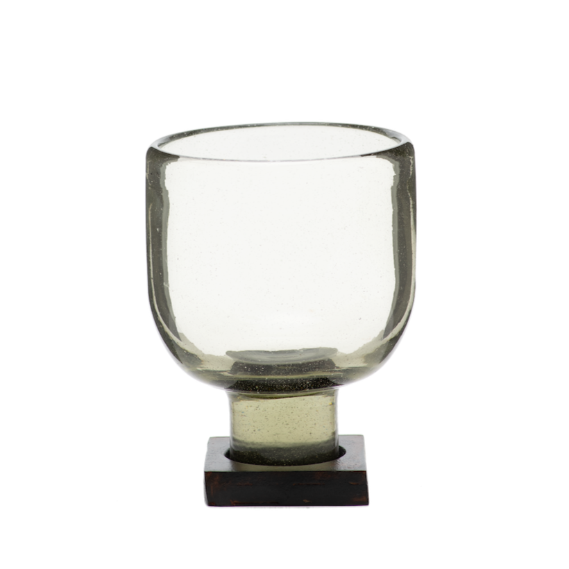 Mouth blown glass vessel bumped up on a glass stem and cast square base . . . candlelight, floral, tequila . . . slightly lifted . . .